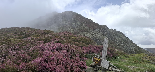 Una vez superado el merendero, se inicia un camino bien marcado, pero muy estrecho. Este año las plantas están muy crecidas y, aunque la senda está muy clara, las plantas van rozando las piernas de caminante. La pendiente es moderada al principio. Hay que superar varias colinas. Todo el camino discurre por la cresta de la sierra Bruteira.